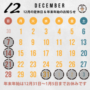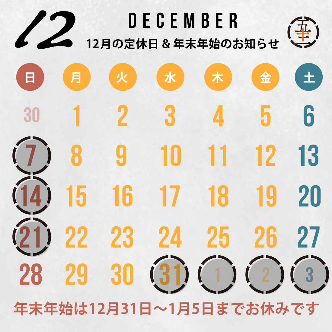 52-ごじゆうに-お知らせNews View all 一覧に戻る 12月の営業のお知らせDate2025.12.01Categoryご案内いつもありがとうございます。12月のお休みスケジュールです。7日14日21日年末年始は12月31日から1月5日までお休みです。みなさまのお越しをお待ちしております!カレンダークリックで拡大します 52-ごじゆうに->お知らせ>12月の営業のお知らせ